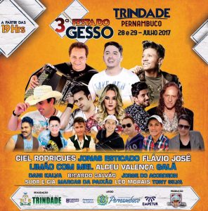 A população de Trindade (PE), no Sertão do Araripe, já conta as horas para a 3ª edição da Festa do Gesso, que acontecerá nesta sexta-feira (28) e sábado (29), na Avenida Principal, sempre às 19h. Grandes nomes da música vão animar o público, entre eles Flávio José, Alceu Valença, Jonas Esticado e Limão com Mel.