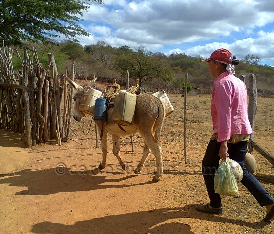 Todos os dias, os moradores são obrigados a percorrer longos caminhos para buscar água em uma cisterna, utilizando carrinhos de mão, animais, carroças ou bicicletas.