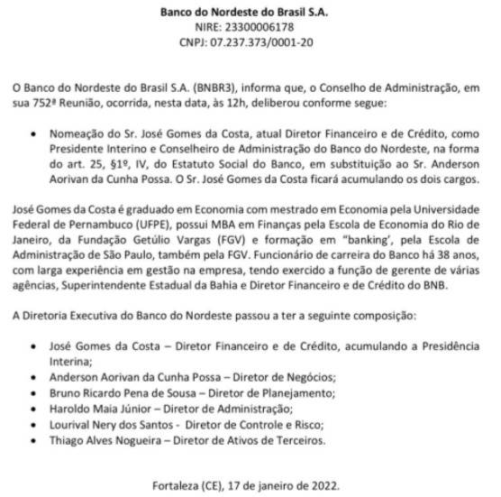 Após o presidente da República, Jair Bolsonaro, decidir há poucos dias não nomear o diretor financeiro e de crédito do Banco do Nordeste (BNB), José Gomes da Costa, agora ele deverá acumular seu cargo com o de presidente interino da instituição. A confirmação aconteceu nesta segunda-feira (17), por meio de uma nota Circular.