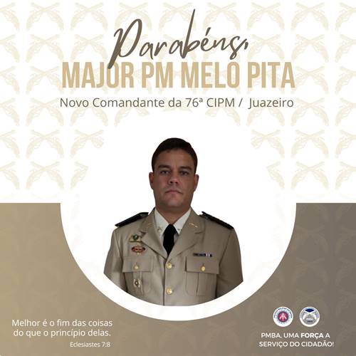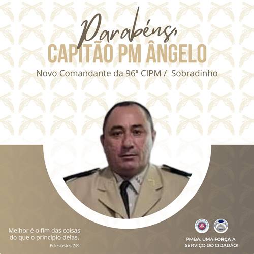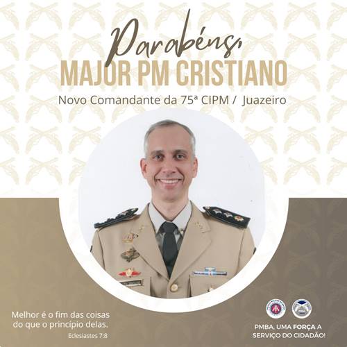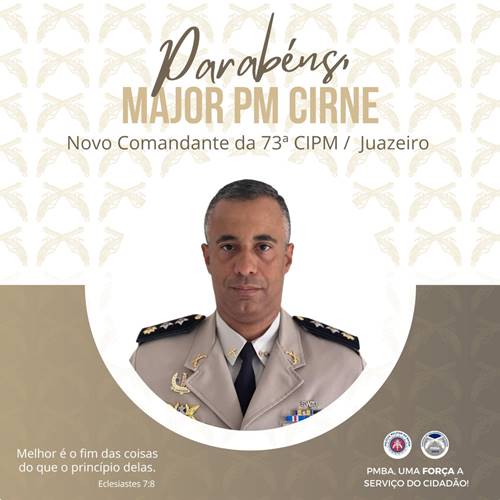 O Major Ederson da Silva Cirne passará a responder pelo Comando da 73ª CIPM, em Juazeiro; o major Alexandro Reges de Sena ficará à frente da 74ª CIPM, também em Juazeiro; O Major Cristiano Roberto Seixas Almeida, vai comandar a 75ª CIPM, em Juazeiro; o Major Sérgio Ricardo de Carvalho Melo Pita será o comandante da 76ª CIPM, também em Juazeiro; e o Capitão Francisco Ângelo de Souza responderá pela 96ª CIPM, em Sobradinho.
