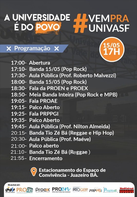 Segundo a Univasf, o evento será uma oportunidade para que os pró-reitores da instituição dialoguem com a sociedade sobre a importância das universidades públicas. A programação do “A Universidade é do Povo” conta com apresentações culturais, aula pública, exposição de trabalhos de pesquisa e extensão dos estudantes universitários, feirinhas e apresentações de bandas musicais.