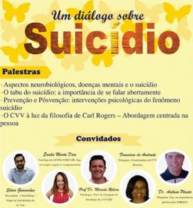 Os palestrantes convidados são Silvio Guimarães, psicanalista do Grupo de Suicidologia do Vale; Ericka Dias, psicóloga do Centro de Estudos e Práticas em Psicologia (CEPPSI) da Univasf e especialista em terapia cognitivo-comportamental; Marcelo Ribeiro, doutor em educação e professor do Colegiado de Psicologia da Univasf; Francisca de Andrade, pedagoga e coordenadora do Centro de Valorização da Vida (CVV) em Petrolina; e Antônio Plauto, psiquiatra especialista em dependência química.