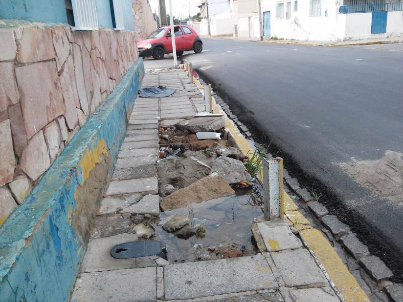 Um vazamento causa desperdício de água na Rua Joaquim André, próximo à Unimagem, no Centro de Petrolina. A tubulação rompida está localizada uma calçada deteriorada.
