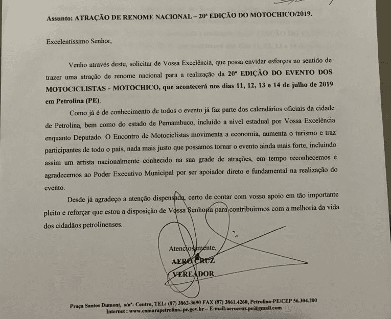 Uma indicação de Aero com essa proposta foi aprovada ontem (7) na Câmara Municipal e o vereador enviou um ofício ao prefeito Miguel Coelho. “O encontro de motociclistas movimenta a economia, aumenta o turismo e traz participantes de todo o país, nada mais justo que possamos tornar o evento ainda mais forte, incluindo um artista nacionalmente conhecido na sua grade de atrações”, justifica Aero, agradecendo o apoio da Prefeitura “por ser apoiadora direta e fundamental na realização do evento”.