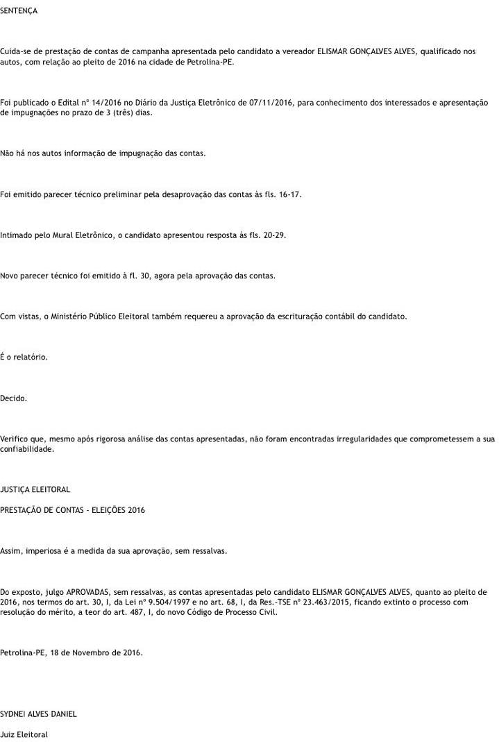 Em contato com este Blog, Elismar enviou uma decisão do Tribunal Regional Eleitoral de Pernambuco (TRE-PE), comprovando que não há nenhuma ressalva em suas contas. Isso o torna apto, portanto, a ser diplomado para assumir seu segundo mandato no Legislativo de Petrolina, a partir de fevereiro de 2017.