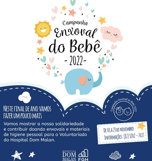 Como já virou tradição, O Voluntariado do Hospital Dom Malan (HDM) em Petrolina iniciou ontem (1) a campanha Enxoval do Bebê 2022. A ação tem como objetivo arrecadar roupinhas de recém-nascidos (novas, seminovas ou em bom estado de conservação), materiais de higiene e primeira necessidade para os bebês e puérperas, como fraldas, sabonetes, talco, shampoo e creme dental.