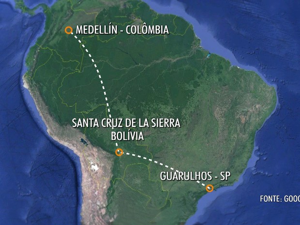 O time da Chapecoense embarcou para a Colômbia na noite de segunda (28), para disputar a primeira partida da final da Copa Sul-Americana, contra o Atlético Nacional, na quarta (30). Inicialmente, a delegação embarcou em um voo comercial de São Paulo até a Bolívia. Lá, o grupo pegou um voo da LaMia.