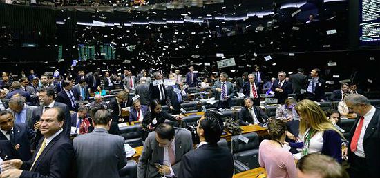 A sessão de votação do pacote de ajuste fiscal do governo Dilma Rousseff foi interrompida por cerca de 20 minutos no início da noite desta quarta (6) após integrantes da Força Sindical que estavam nas galerias da Câmara protestarem e atirarem notas de ‘petrodólares’ no plenário, sobre os deputados.